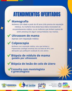 A iniciativa acontece através da parceria entre o Governo de Pernambuco e a Prefeitura Municipal de Ferreiros, por meio da Secretaria de Saúde, levando serviços especializados de forma gratuita e mais próxima da população.