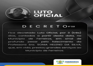 Fica decretado Luto Oficial, por 3 (três) dias, contados a partir desta data, no Município de Ferreiros, em sinal de profundo pesar pelo falecimento da Professora Sra. SONIA HELENO DA SILVA, que, em vida, prestou grandes serviços ao Município de Ferreiros.